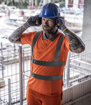 50% recycled polyester/50% polyester. Conforms to EN ISO 20471: 2013 + A1: 2016 class 2.RIS-3279-TOM (orange only).Soft touch, wicking micro mesh.UPF 40+ protection.Contrast ribbed collar.Taped neck.Two reflective bands on front, back and one over each shoulder.Side vents.Drop tail.Twin needle sleeves and hem.Branded tab on lower left side seam.