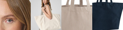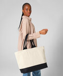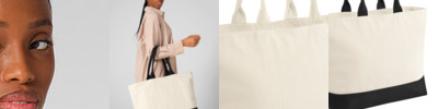 Premium heavyweight fabric. External slip pockets. Contrasting colour base and handles. Self-fabric carry handles. Can be carried by hand or over the shoulder. Contains 100% GOTS-certified organic cotton, certified by Control Union CU811033.