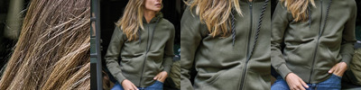 Three-thread fabric. Brushed inside. Ribs with elastane and SBS zipper. Double dyed. Double stitched. Washable at 60˚C.