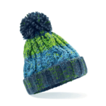 Tearaway label for ease of rebranding, Cuffed design for optimal decoration, Heavyweight multi yarn cable knit design, Luxurious shearling thermal band for extra warmth, Luxury pom pom, Bold four colour stripe design
